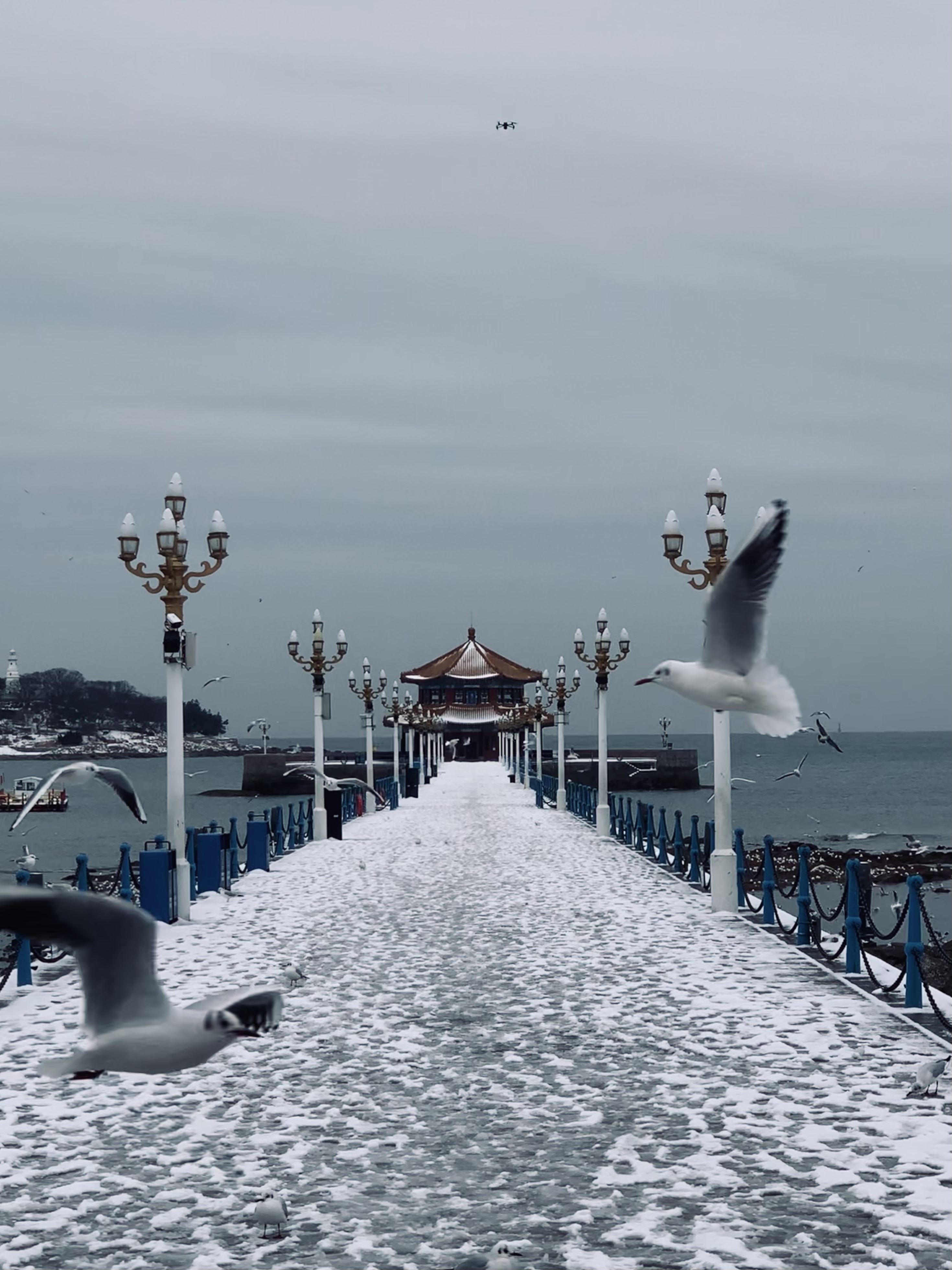 作品说明:在这幅作品中,雪后的栈桥矗立中央,如一幅静谧的画卷缓缓展开。桥身两侧,两只海鸥翩翩飞来,恰似两位优雅的舞者,在空中划出优雅的弧线,为画面注入了动感和生机。雪后的栈桥,银装素裹,与纯净的天空相映成趣,海鸥的加入更是为这幅画面增添了几分灵动与诗意。整个画面构图对称,既展现了雪后栈桥的静谧之美,又凸显了海鸥的灵动之姿,令人陶醉。