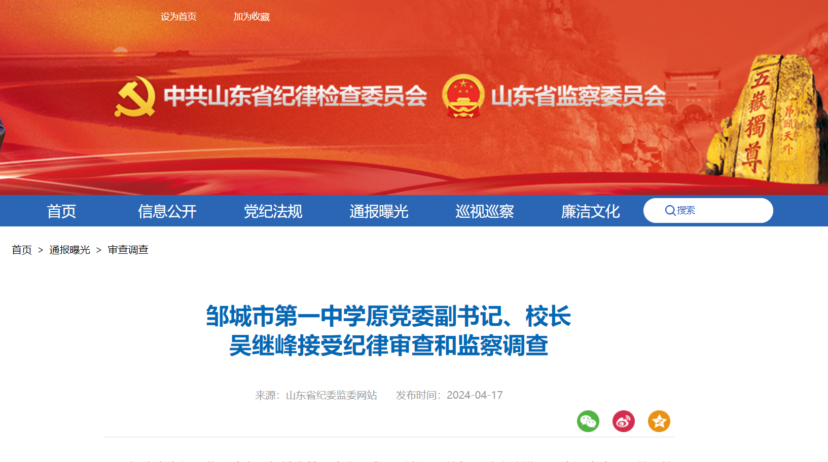 邹城市第一中学原校长吴继峰被查,涉嫌严重违纪违法