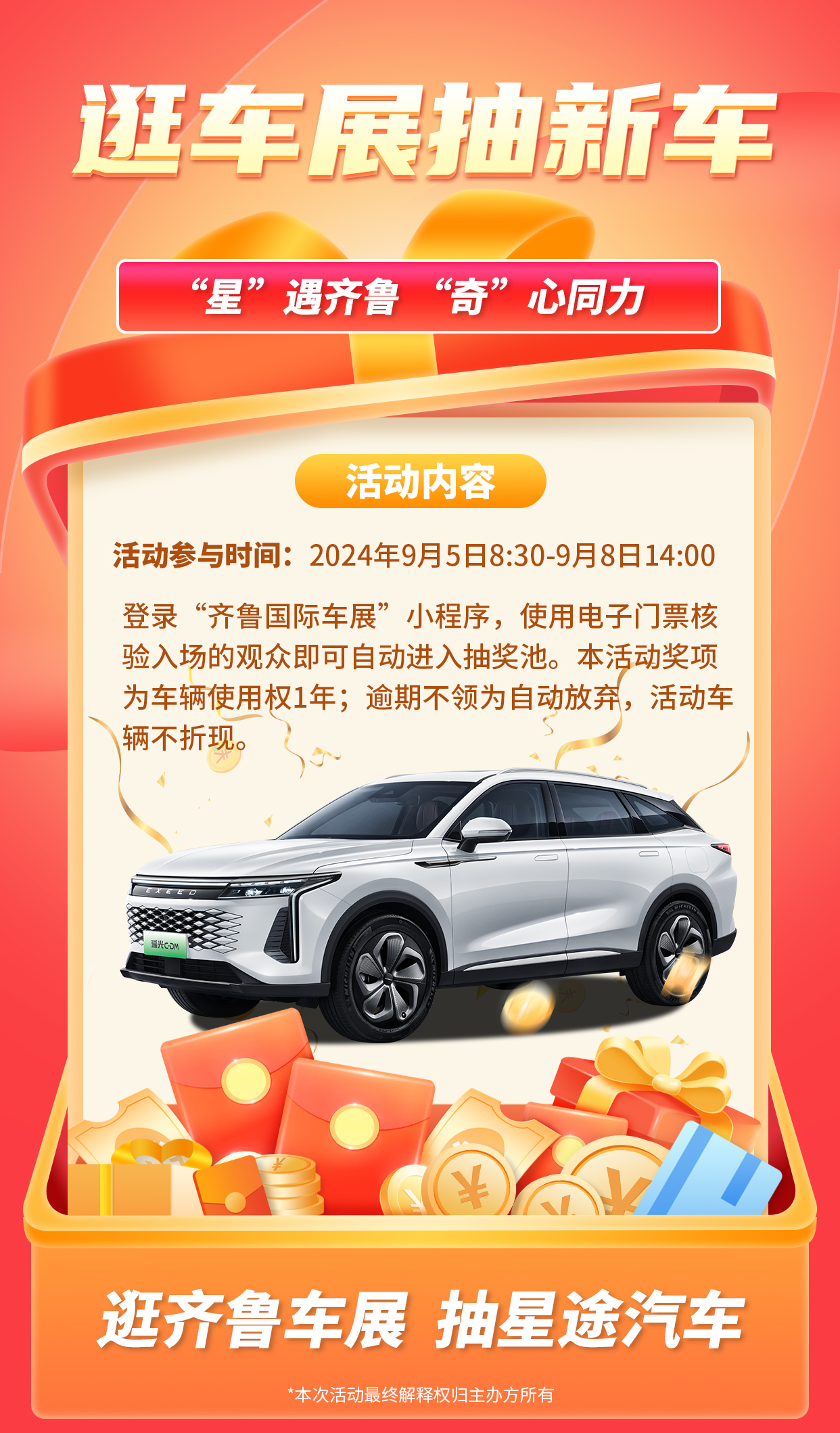 为庆祝这具有里程碑意义的一届齐鲁车展,丰富展会活动形式,回馈观众多年来的支持,作为齐鲁车展的特别支持品牌,届时,星途汽车不仅将携旗下多款热销车型集体亮相,同时还将在车展期间,倾情推出“星”遇齐鲁,“奇”心同力——逛齐鲁车展,抽星途汽车活动:凡是在活动期间参观车展的消费者,就有机会抽取星途瑶光C-DM汽车,共四台(车辆使用权一年)。