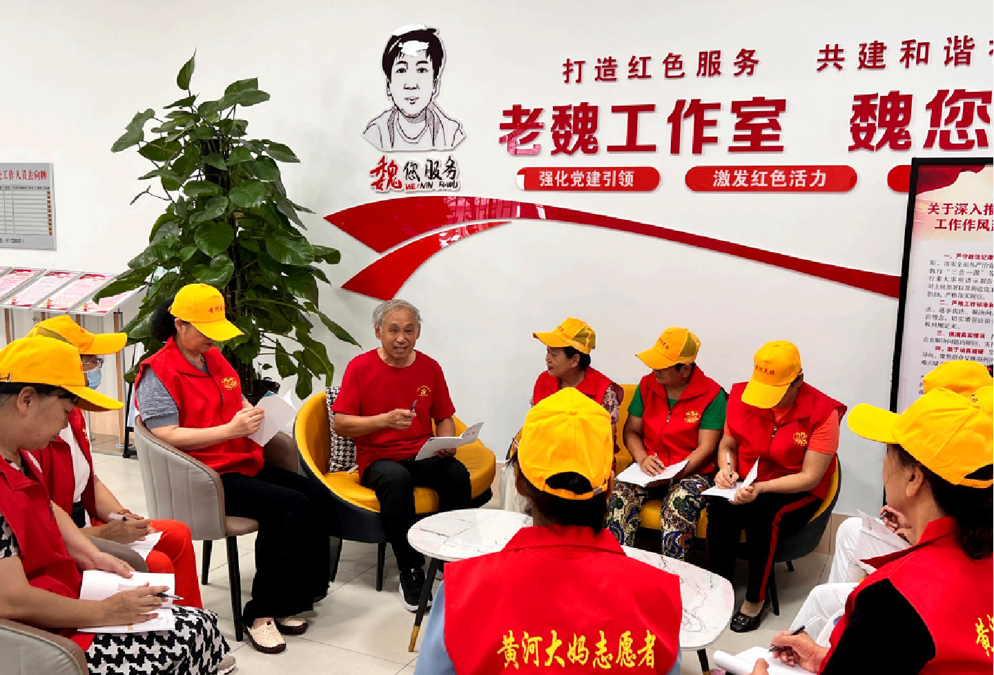 2024年6月,在滨州市滨城区彭李街道黄河社区“老魏工作室”,离退休老党员蒋爱学与黄河大妈志愿者围绕社区老年助餐服务进行深入讨论。