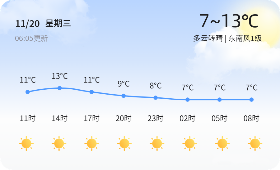 今天是2024年11月20日,农历十月二十,济宁的天气呈现为多云转晴,气温在7℃至13℃之间波动。东南风1级轻拂,空气湿度高达89%,使得体感温度略低。空气质量方面,PM2.5浓度为59微克/立方米,属于良好级别,适宜市民外出活动。但早晚温差较大,建议市民朋友们适时增减衣物,携带外套,以防感冒。出行时,可选择步行或骑行等低碳方式,享受清新的空气和美好的天气。