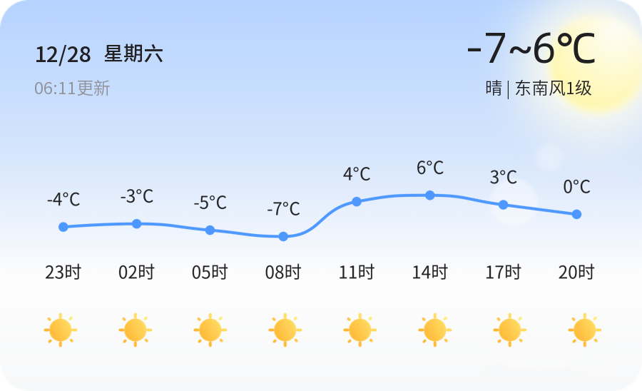 今天是2024年12月28日,农历十一月廿八,德州迎来了晴朗的天气,但气温较低,最高气温6℃,最低气温降至-7℃,伴有东南风1级,空气湿度67%,空气质量为轻度污染,PM2.5浓度为63微克/立方米。晴冷的天气对市民出行有一定影响,建议市民外出时做好保暖措施,穿戴厚实衣物,并注意佩戴口罩以减少空气污染对呼吸道的刺激。此外,晴朗的天气有利于晾晒衣物和开窗通风,但早晚温差大,需适时增减衣物。