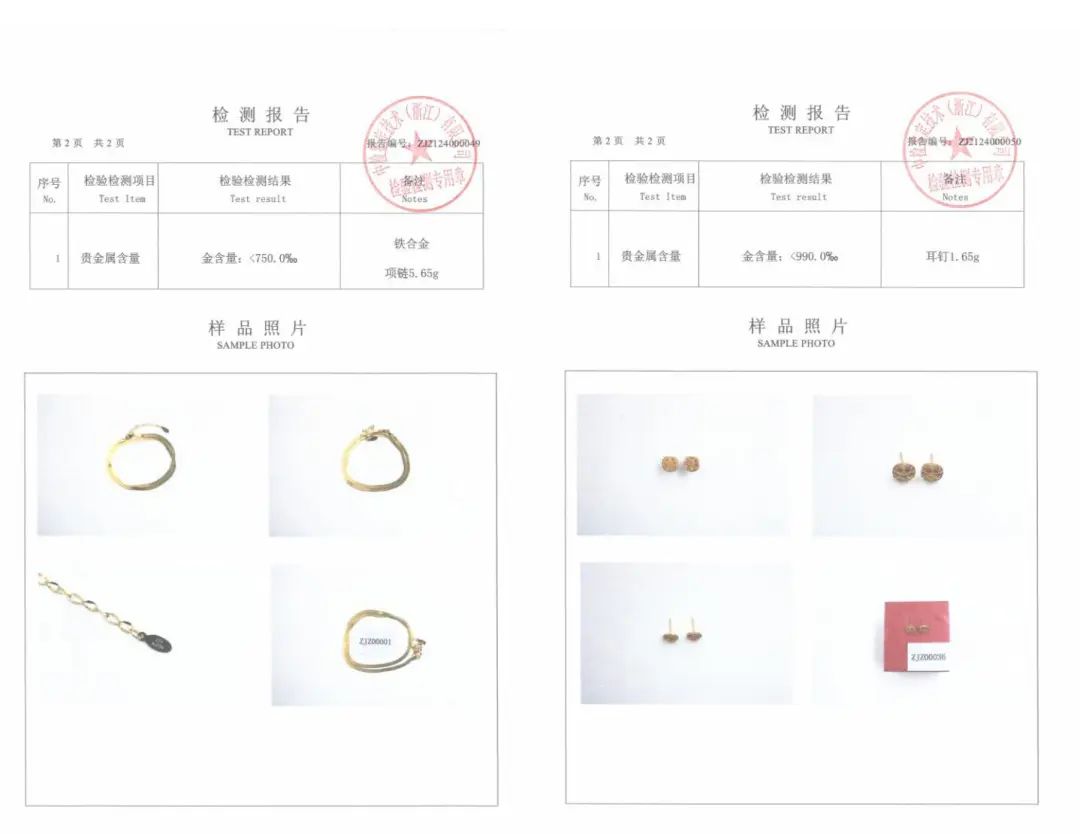 周大福18K金项链、周六福足金999黄金女耳钉的检测报告。资料图片