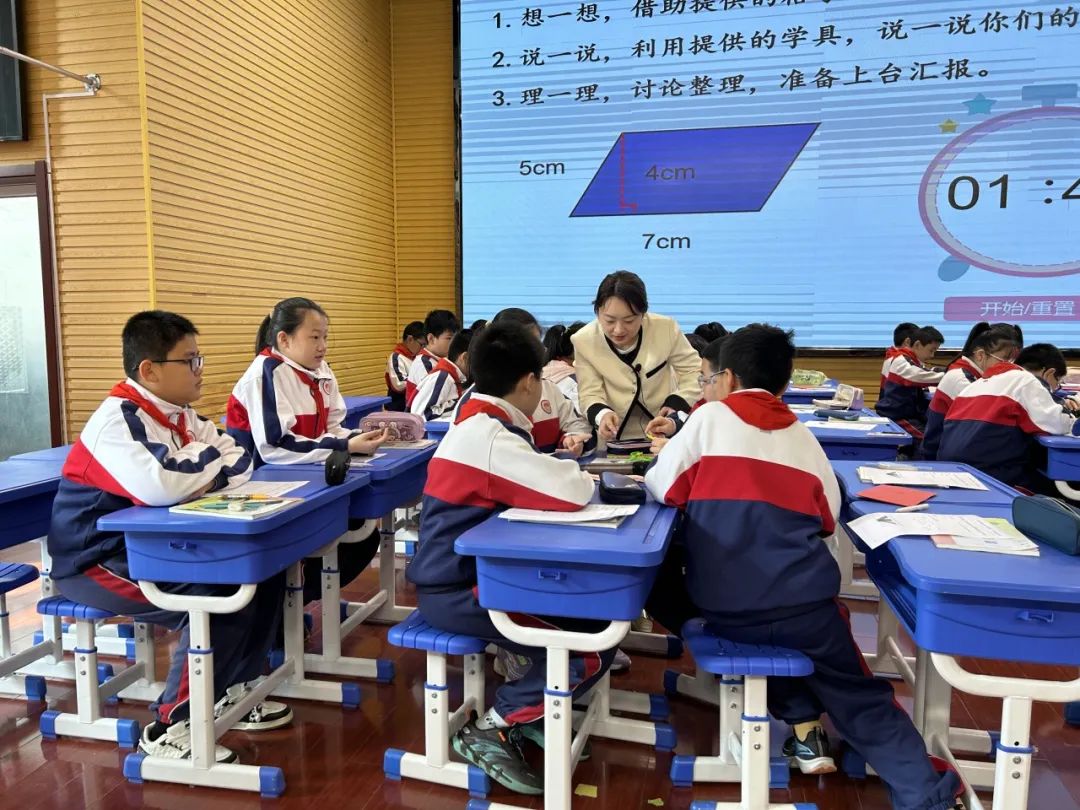 张苗苗执教的《平行四边形的面积》一课,巧妙地将数学知识与生活实际紧密相连。她以学生身边发生的实例为切入点,为学生提供直观且具体的学具,让抽象的数学概念瞬间变得鲜活起来。这种教学方式极大地激发了学生的好奇心与求知欲,使课堂氛围活跃非凡。在教学过程中,同学们从最初对平行四边形面积计算的大胆猜想,到借助数格子的方法让平行四边形与长方形的关系逐渐明晰,再到最终通过动手操作确定两者之间的内在联系。整个探索过程环环相扣,生动地展现了数学转化思想的重要性。这不仅有助于学生更好地理解和掌握知识,更培养了他们的数学思维和探究能力。