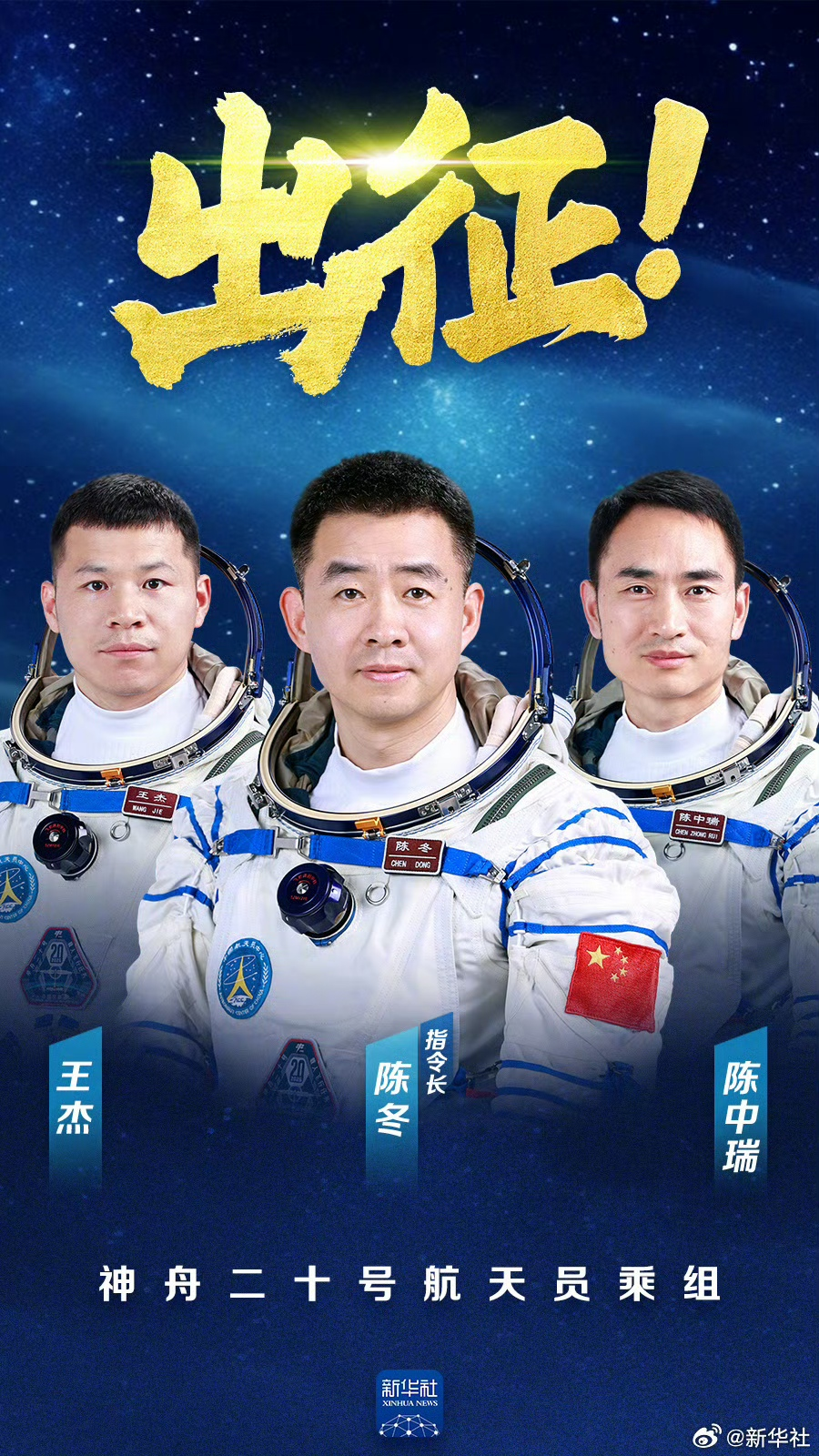 4月24日是中国航天日,神舟二十号乘组于今日出征太空!据中国载人航天工程办公室消息,经空间站应用与发展阶段飞行任务总指挥部研究决定,执行神舟二十号载人飞行任务的航天员乘组由陈冬、陈中瑞、王杰3名航天员组成,陈冬担任指令长。航天员陈冬执行过神舟十一号、神舟十四号载人飞行任务,时隔两年再次担任指令长。陈中瑞和王杰均来自于我国第三批航天员,是首次执行飞行任务。