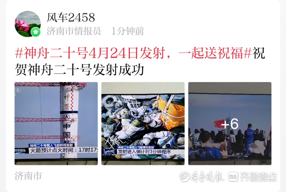【参与方式】:下载齐鲁晚报官方客户端——齐鲁壹点,在情报站发送情报,参与话题#神舟二十号4月24日发射,一起送祝福#+文字/图片/短视频/音频上传即可参与。