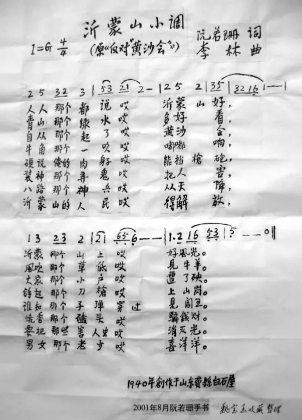 1940年,刚建立不久的沂蒙抗日根据地不仅面临日寇的“扫荡”,还面临国民党顽固派支持的“黄沙会”的威胁。该反动组织不断散布谣言,还欺骗群众钱粮,抢掠群众财产。当年6月,驻扎在蒙山的抗大一分校文工团团员阮若珊、李林,配合中共中央山东分局扫除“黄沙会”的战斗创作歌曲《反对“黄沙会”》。该歌曲以“人人那个都说哎沂蒙山好”开头,前半部分歌颂沂蒙山好风光,后半部分揭露“黄沙会”罪行。当群众听到该组织“装神弄鬼把人害,烧香磕头骗钱财”时,纷纷觉醒。当月,八路军山东纵队经过激战,彻底击溃“黄沙会”。