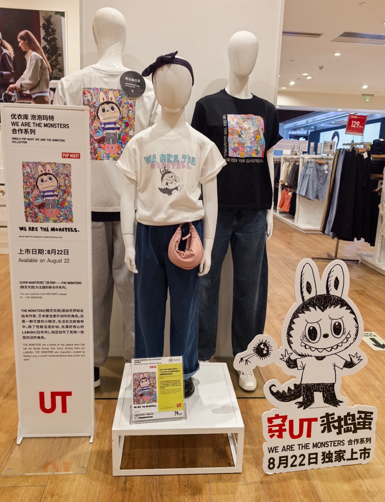 2025年8月22日,优衣库与泡泡玛特旗下热门IP"THE MONSTERS"联名系列正式发售,推出了包含LABUBU形象的共14款男女装及童装T恤、卫衣,尽管此次发售现场没有出现以往通宵排队的现象,但仍吸引了不少消费者前来选购。