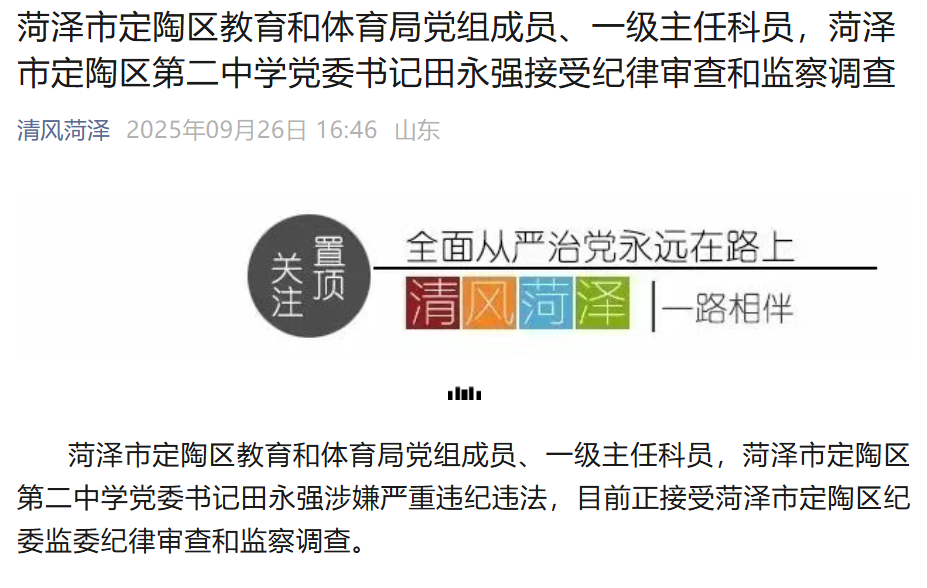 据“清风菏泽”9月26日消息,菏泽市定陶区教育和体育局党组成员、一级主任科员,菏泽市定陶区第二中学党委书记田永强涉嫌严重违纪违法,目前正接受菏泽市定陶区纪委监委纪律审查和监察调查。