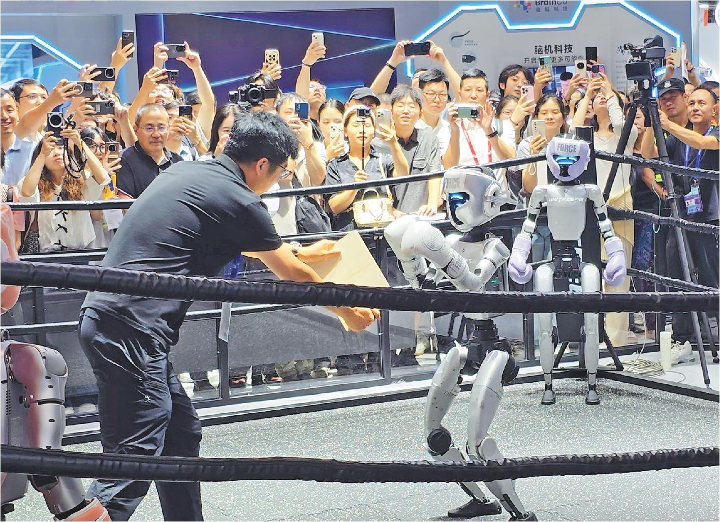 杭州大会展中心内,宇树科技的机器人正随着裁判的指挥进行拳击比赛;不远处的人工智能展厅里,一组机器人在优雅地弹着钢琴……