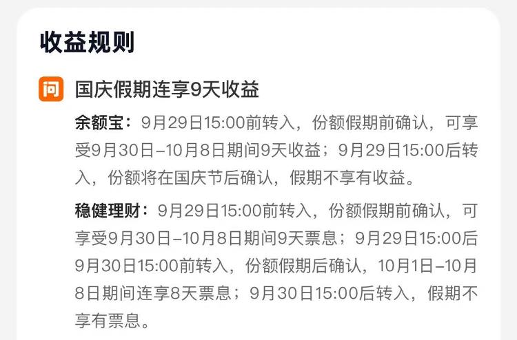零钱通和余额宝发布的规则显示,9月29日15:00前转入资金,最晚9月30日开始产生收益,10月1日收益到账,国庆中秋假期(10月1日—10月8日)收益不间断。若在9月29日15:00后转入,假期将无收益入账。