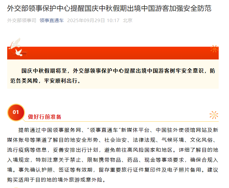 外交部领事保护中心提醒国庆中秋假期出境中国游客加强安全防范