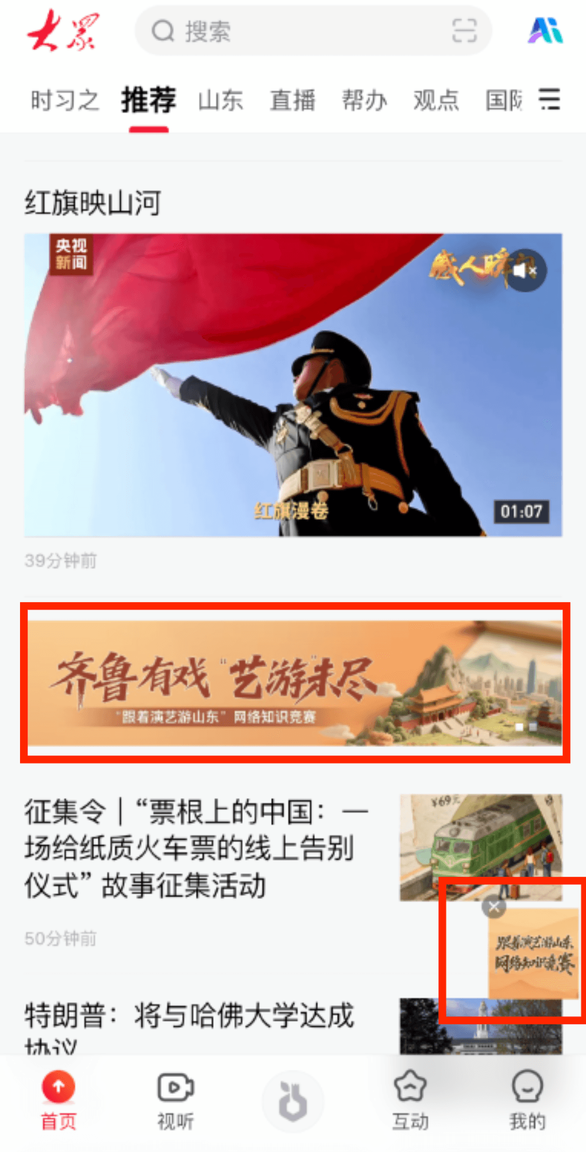 ●方式二:打开大众新闻客户端,在首页右下方找到“跟着演艺游山东”网络知识竞赛悬浮气泡,点击即可参与答题。