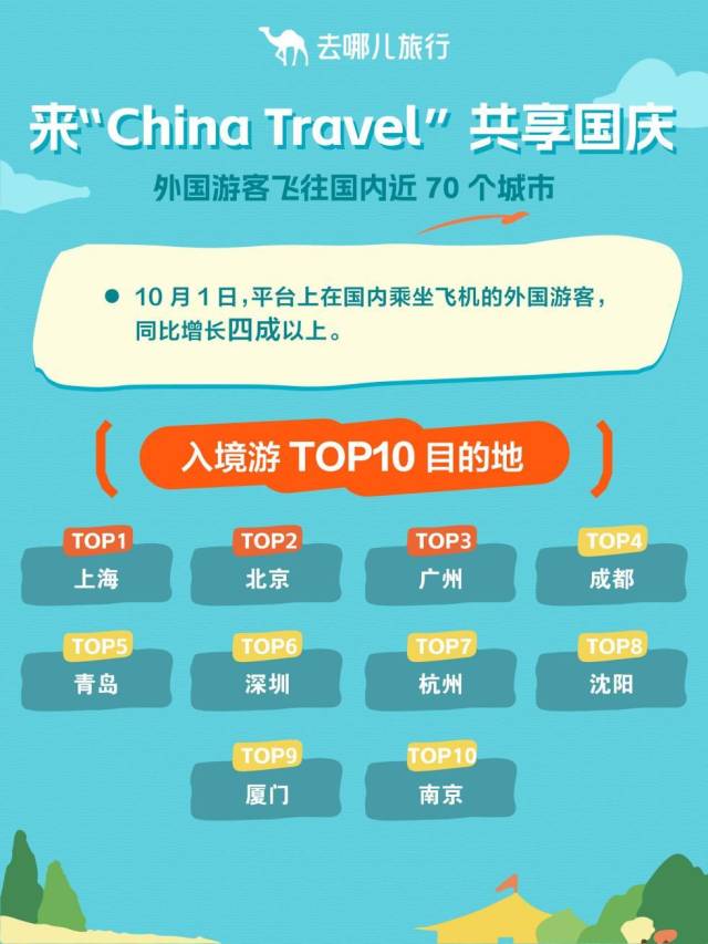 国内长假火爆,入境体验中国的海外游客也同样火。去哪儿数据显示,10月1日,平台上在国内乘坐飞机的外国旅客数量同比增长四成以上,飞往了国内70个城市。入境游Top10目的地城市是:上海、北京、广州、成都、青岛、深圳、杭州、沈阳、厦门、南京;Top5客源国是:韩国、日本、马来西亚、新加坡、泰国。