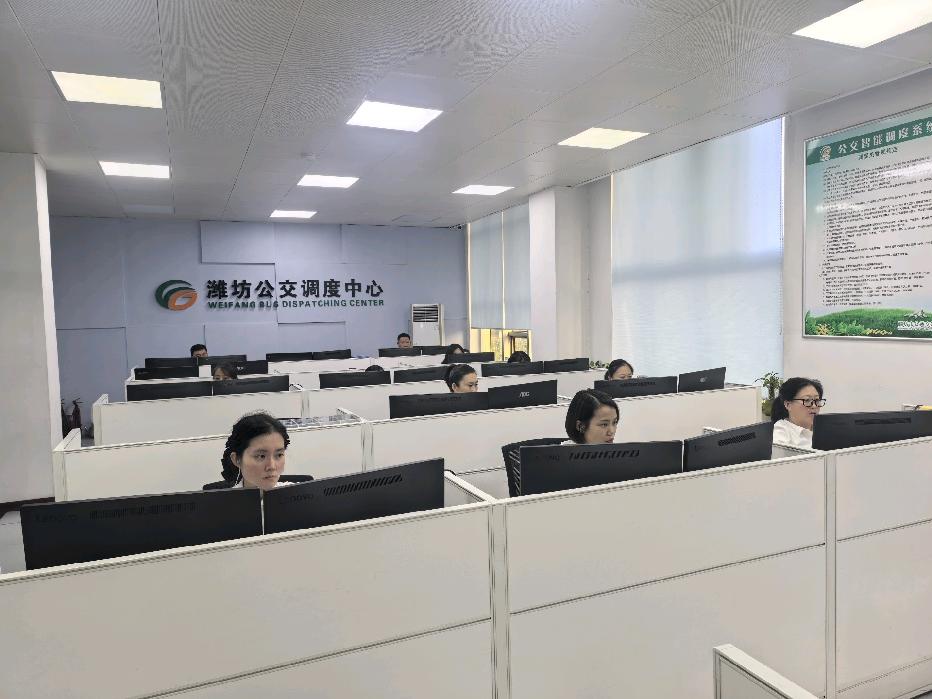 10月2日凌晨5点,潍坊市公交集团调度管理中心内已一片繁忙。15个调度坐席前,调度员双眼紧盯着面前的两块显示屏,目光在屏幕间不停游走。这两块屏幕各有分工:一块车辆运行图上,每人负责的十几条线路如同清晰脉络,每辆公交车的实时位置、行驶速度、前进方向一目了然;另一块则通过全方位视频监控,实时捕捉司机操作状态、车厢乘客情况、路面通行条件等信息,如同“千里眼”覆盖运营全流程。