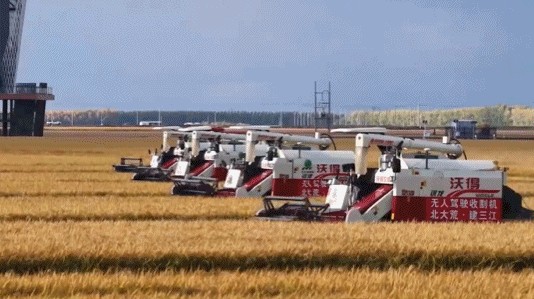在黑龙江北大荒建三江七星农场,无人机跟随多台无人驾驶收割机,记录正在进行中的秋收大会战;在五常大米核心生产基地,穿越机飞越广袤田野,稻穗编织成的“黄金毯”一览无余,稻谷被整齐划一地“吞”入农机“口中”,开启这个丰收季沉甸甸的收获。