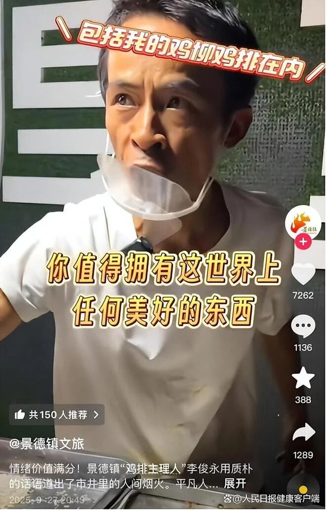 “你可以拒绝我,但是你不能拒绝美味。”“鸡排免费,塑料袋6块。”“你值得拥有这世界上任何美好的东西,包括我的鸡柳鸡排。”这些充满幽默感和情绪价值的金句,让江西景德镇的鸡排摊主李俊永迅速走红网络。他的抖音账号粉丝暴涨至80余万,现实摊位更是被里三层外三层的人群包围。