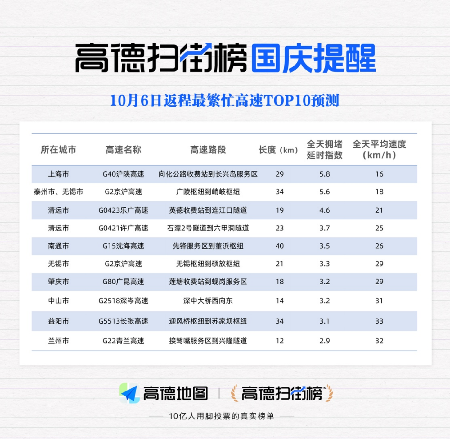 图说:高德扫街榜预测返程高峰全国最繁忙高速TOP10
