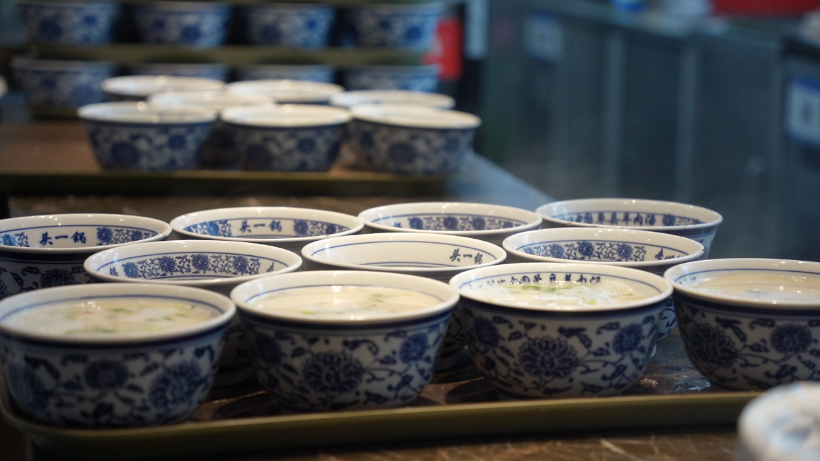 经过数小时的熬制,羊肉汤变得浓稠醇厚,羊腹腔油脂覆于汤面,锁住鲜味,“水脂交融,色白似奶”。