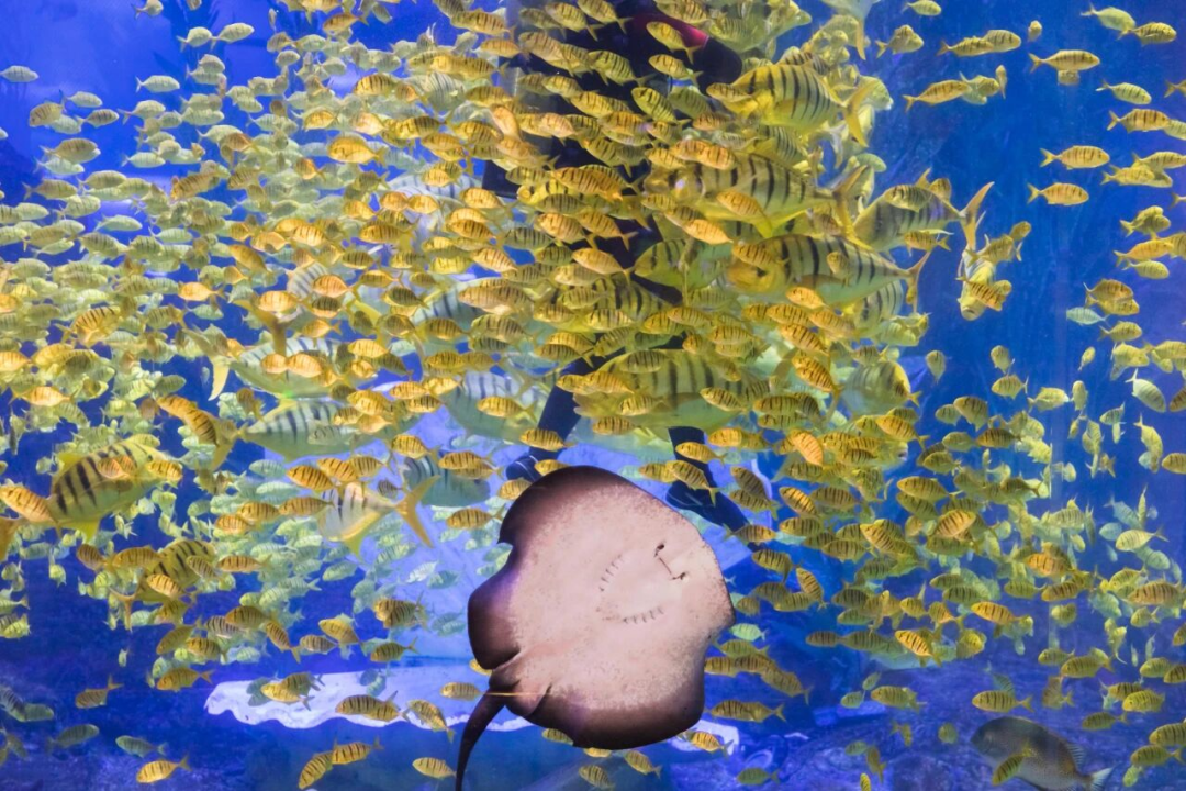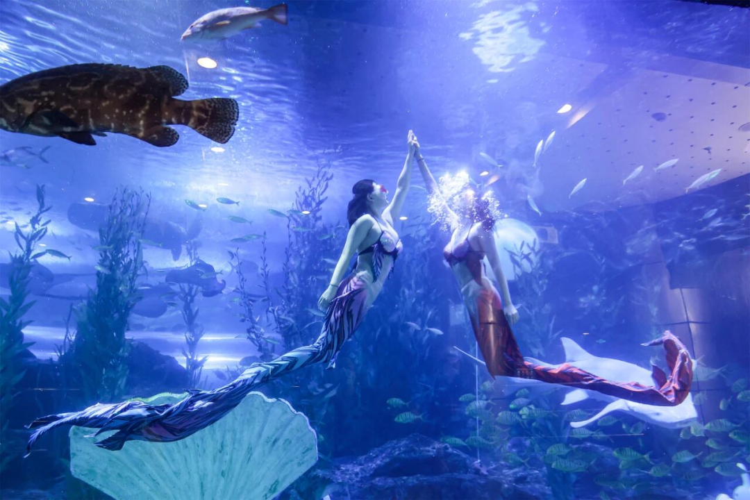 海底隧道里斑斓鱼群伴身游,水母宫光影如梦,随手拍就是中秋氛围感大片;夜场灯光映着蔚蓝海水,宛如“海底赏‘月’”般浪漫。