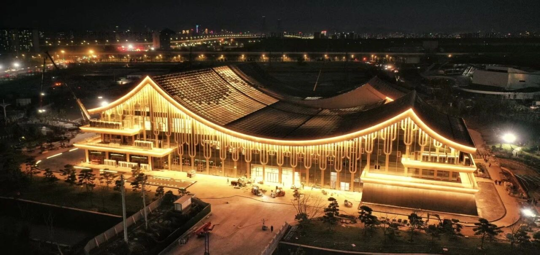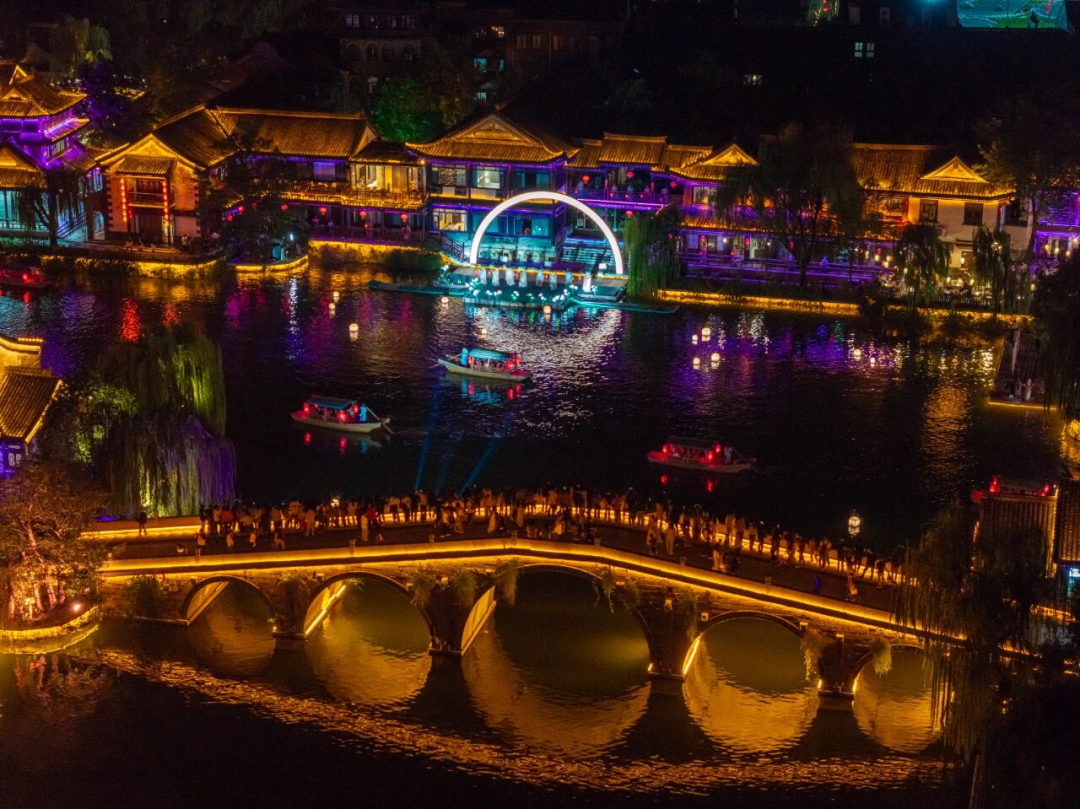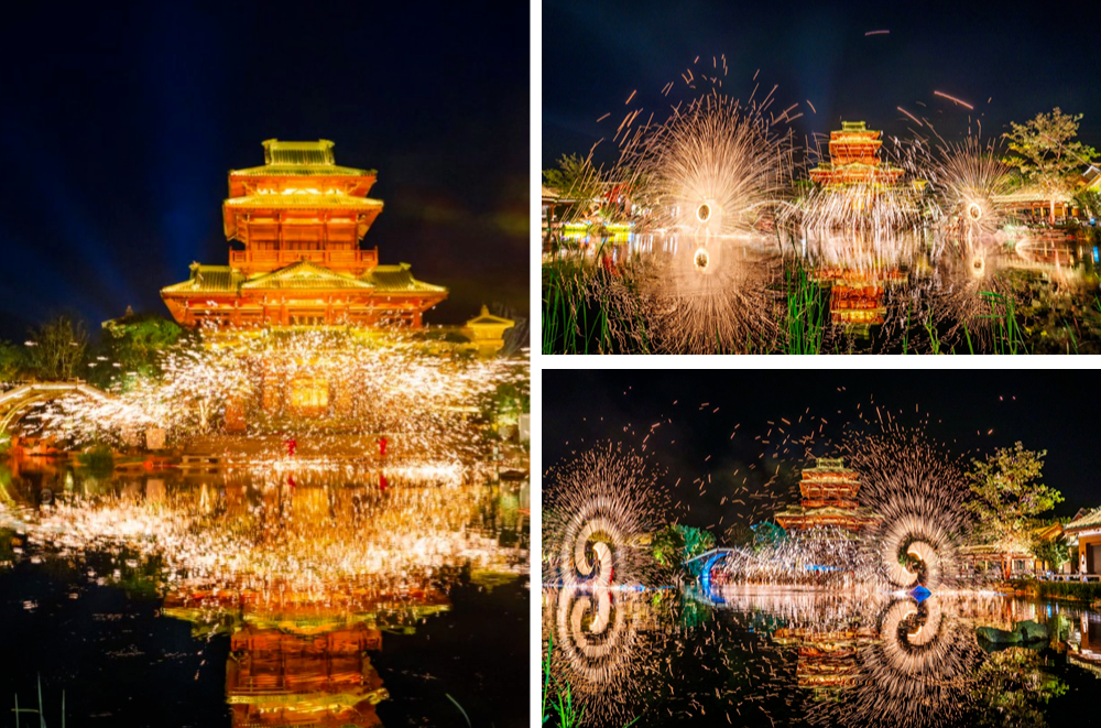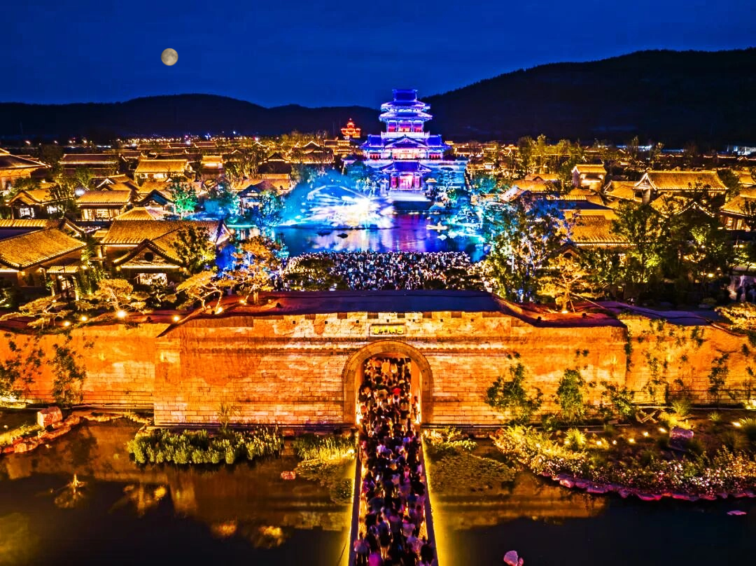 夜幕降临,“鹊华星河·宋韵千灯”灯光秀点亮全园区,光影与明月相映,铺展成流动的古画卷。