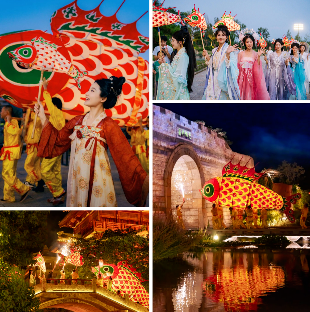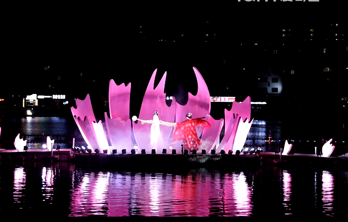 牛市汪的盈盈水面,化身梦幻舞台,舞者翩然与水中倒影共舞。四周莲花灯盏盏浮动,光影交织,水波潋滟,织就空灵幻境,恰衬中秋清辉。