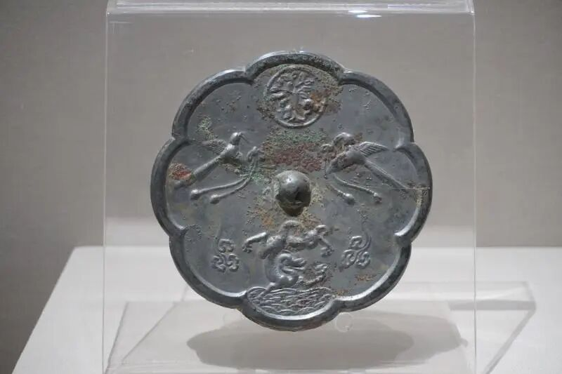 直径15.1厘米,八出葵花形,圆钮,素缘。镜钮两侧为口衔绶带,展翅飞翔的喜鹊,尾羽舒展,绶带飘摇,画面极富动感。钮下方为蛟龙出水图,龙身屈曲盘绕,身旁流云飞动。钮上月宫内有桂树、蟾蜍和捣药的玉兔。月宫两旁分饰一朵祥云。构图简洁,纹饰清雅,白光。中国文化讲究图必有意,意必吉祥。喜鹊是报喜鸟,象征吉祥。绶带乃是印之系,代表着官秩禄位。