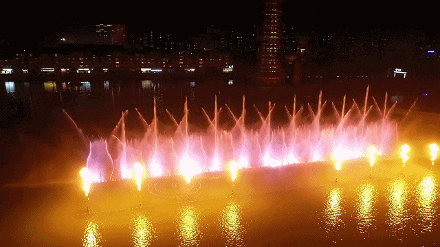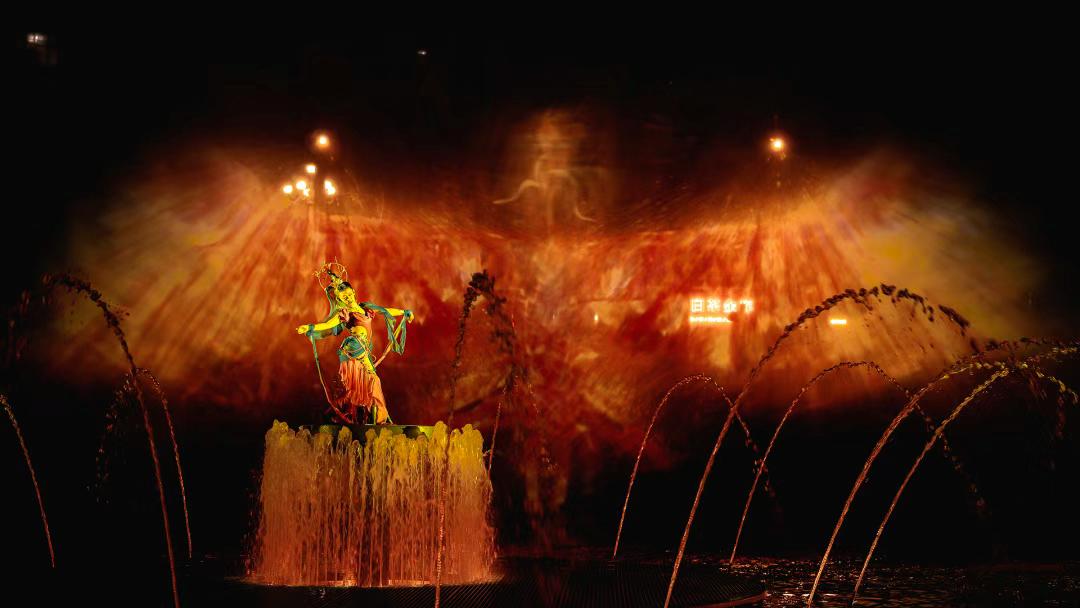 舞蹈演员伴着月色,跳出“牡丹绽放”的柔美,喷泉灯光秀的光影随月色流转,水花勾勒出牡丹与月光交织的梦幻画面,满是中秋的雅致氛围。