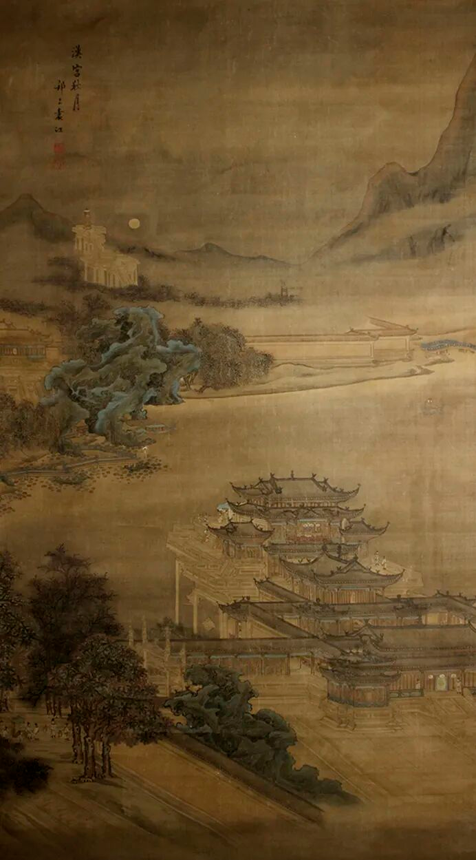 绢本设色,纵188厘米,横103厘米,一级文物。款识:汉宫秋月。邗上袁江。钤印:袁江(白文)、文涛(朱文)。