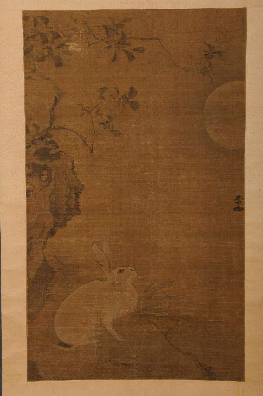 立轴,绢本水墨。纵94厘米,横55.5厘米,二级文物。秋天的夜晚,一只白色的兔子蹲在坡石上,两耳竖起,神情专注地望着一轮满月。兔子的身后有巨石一块,两枝桂花从石后斜出。坡石下,作者用极淡的笔墨画出数丛杂草,若有若无,凸显了夜色的朦胧,也把玉兔衬托得更突出。整幅画面笔墨潇洒,勾线遒劲准确。款署:“平山”。
