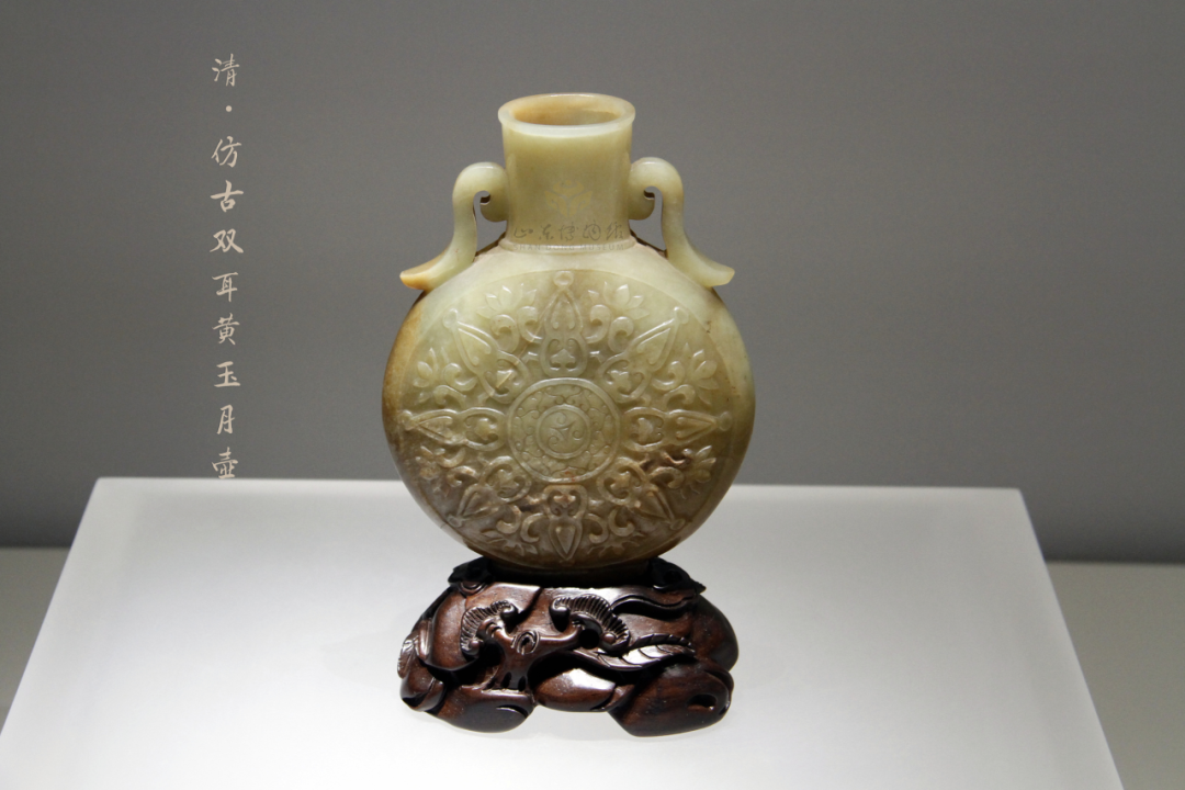 其造型仿照瓷器中的宝月瓶(又称“抱月瓶”),器身呈扁平圆形鼓腹状,正反两面以浅浮雕技法雕刻繁复花纹,线条流畅俊逸,花叶纹理极具立体感。该玉壶双耳设计独特,配以红木底座,整体造型典雅富丽。