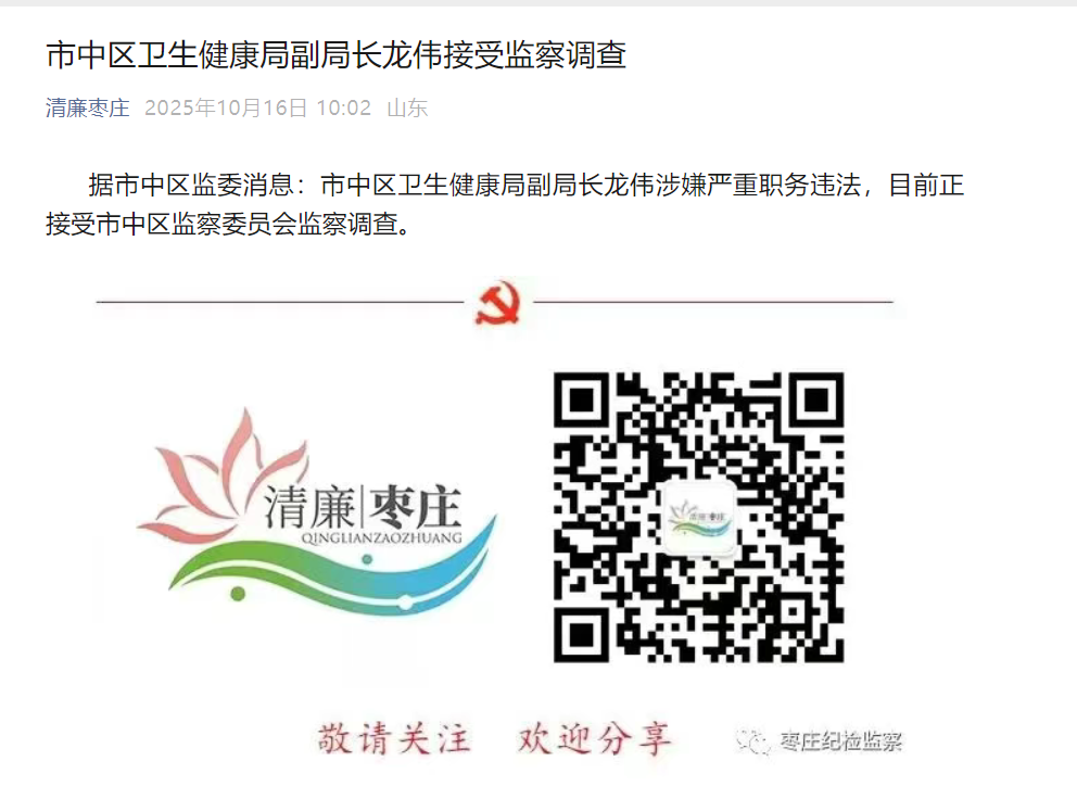 枣庄:市中区卫生健康局副局长龙伟接受监察调查清廉枣庄 孟令洋 2025-10-16 13:12:23 据市中区监委消息:市中区卫生健康局副局长龙伟涉嫌严重职务违法,目前正接受市中区监察委员会监察调查。责任编辑:苏子龙