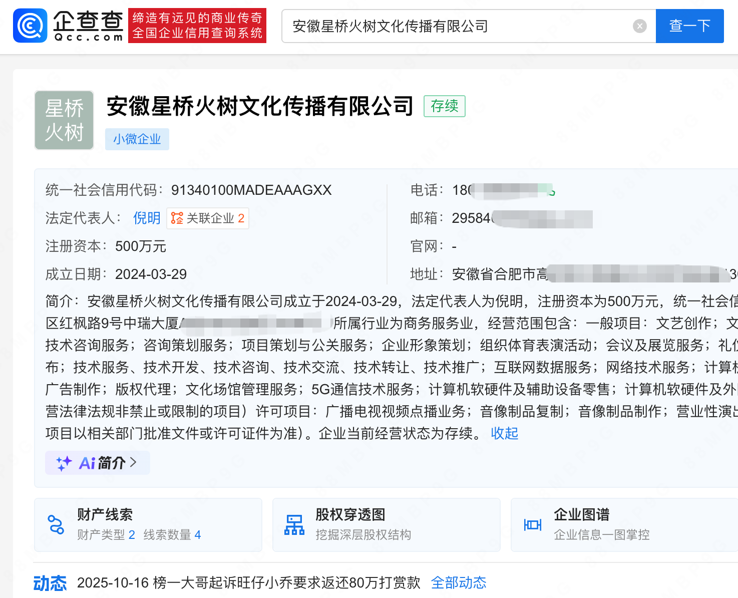 据悉,旺仔小乔经纪公司为安徽星桥火树文化传播有限公司,查询企查查APP发现,该公司成立于2024年3月,注册资本500万,10月10日该公司因无法联系,被依法公告送达劳动仲裁申请书等,申请人为苏某某,将定于11月24日在成都开庭审理。