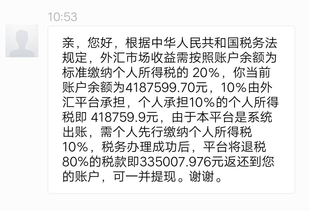 “老公,为什么我提现的钱一直没有到账”“宝贝,别急,我这里也出现了问题,我提现一千多万也没有到账,刚才我问了客服,说是要交税”“啊?之前没有说过要交税啊,要交多少啊?”“客服说因为是大额提现,需要交提现金额10%的税,提现以后会退80%的税款给我们”“天啊,那我就要交40万的税,我哪儿还有钱啊?”“宝贝别急,你不用管了,税款的事我去想办法”