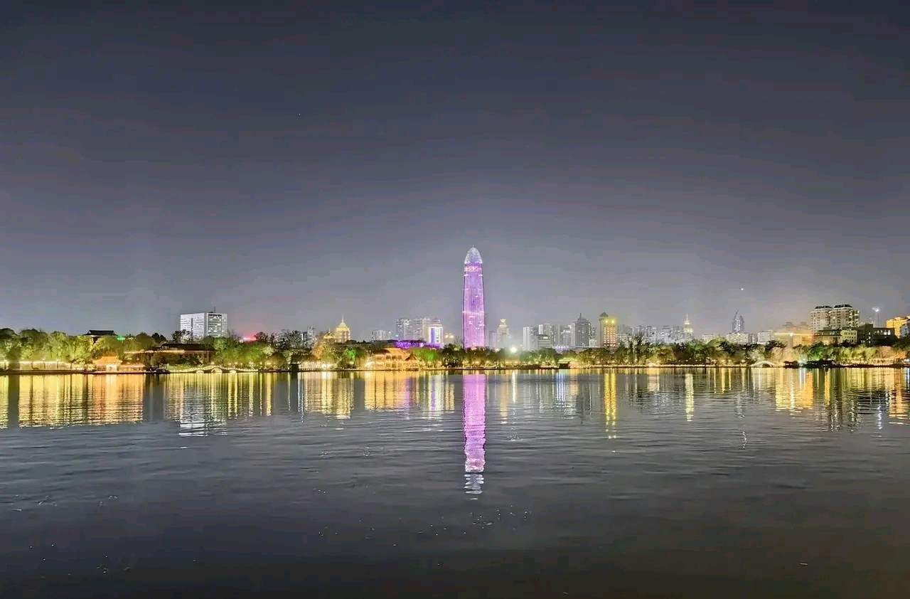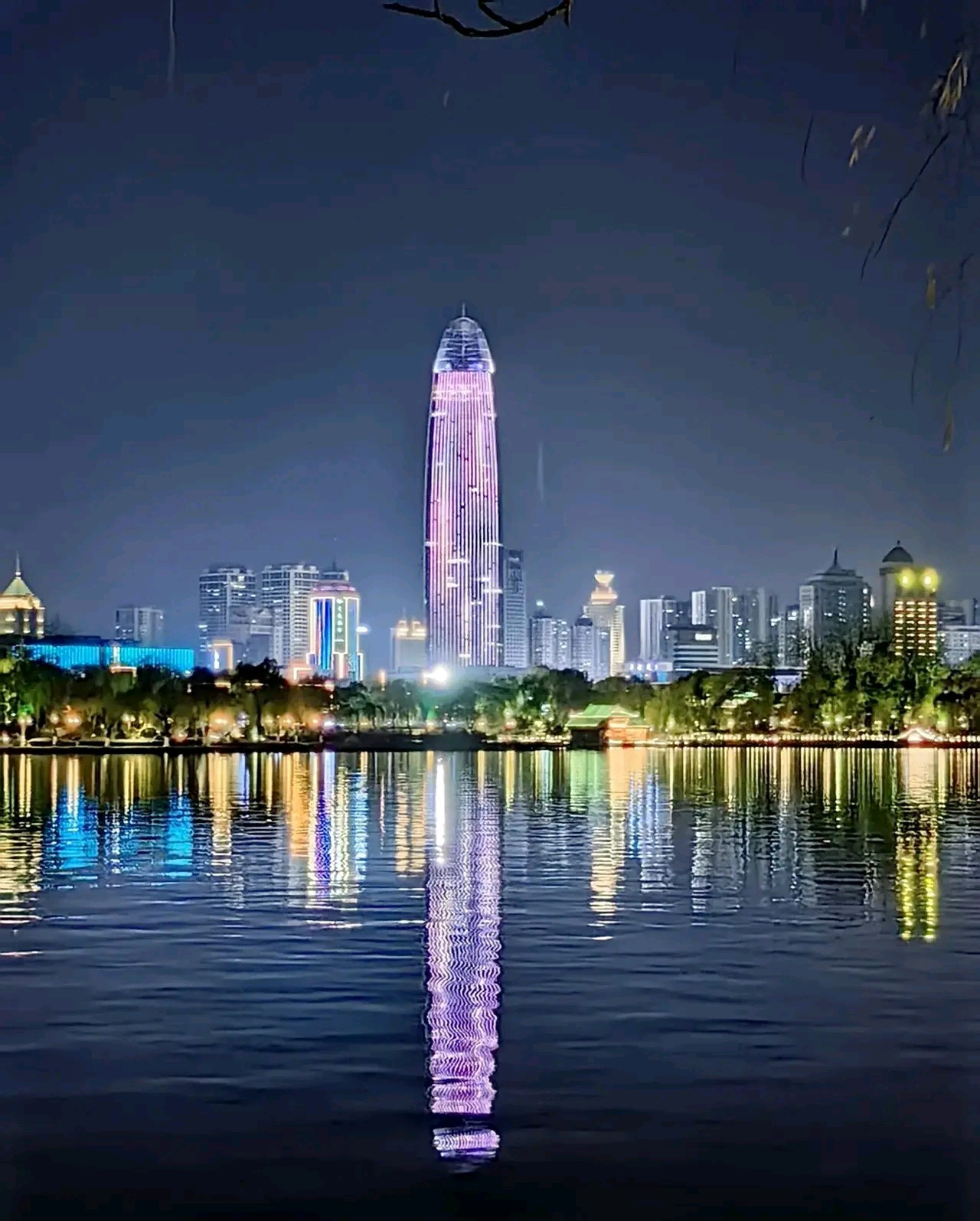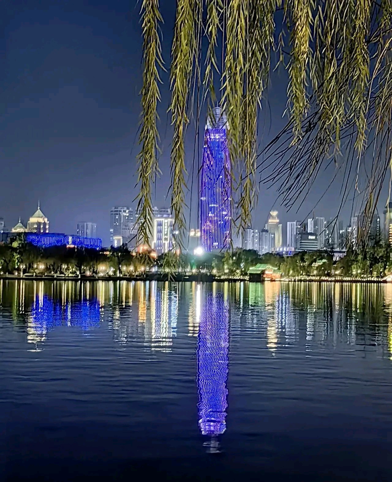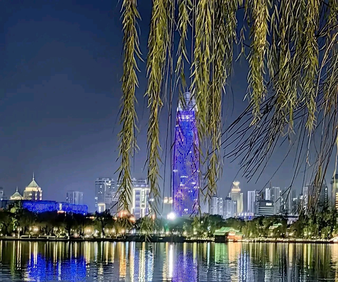济南大明湖灯光璀璨夜色美景。第一高绿地中心在大明湖的映衬下显得更加雄壮挺拔。
