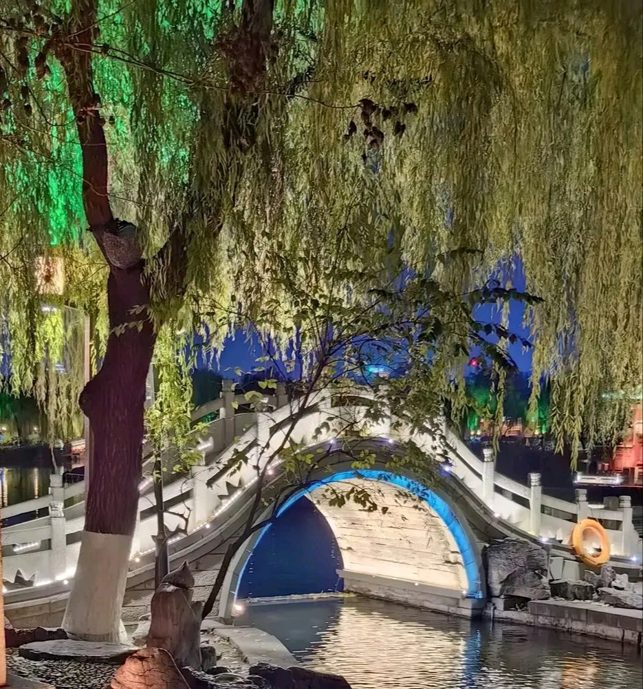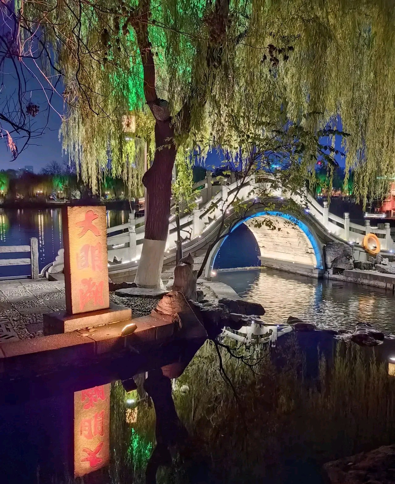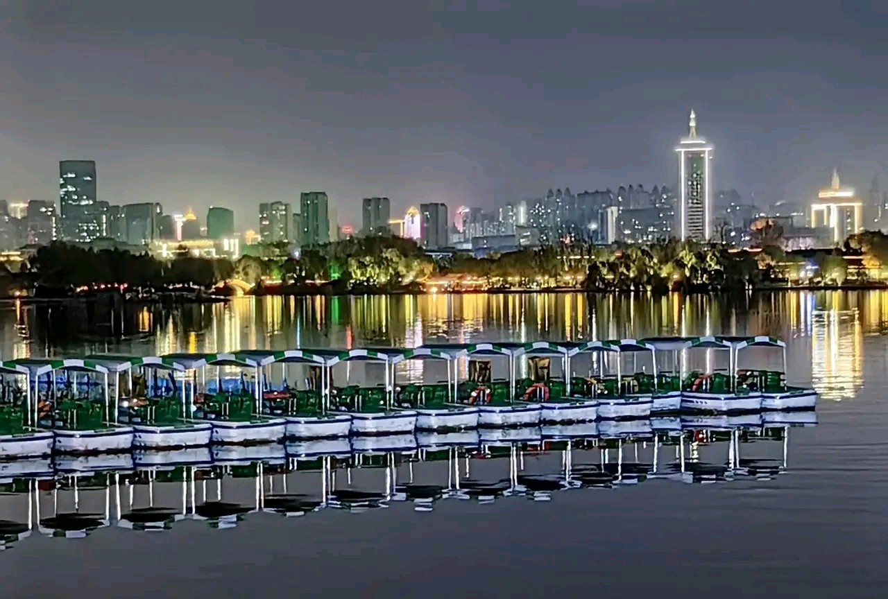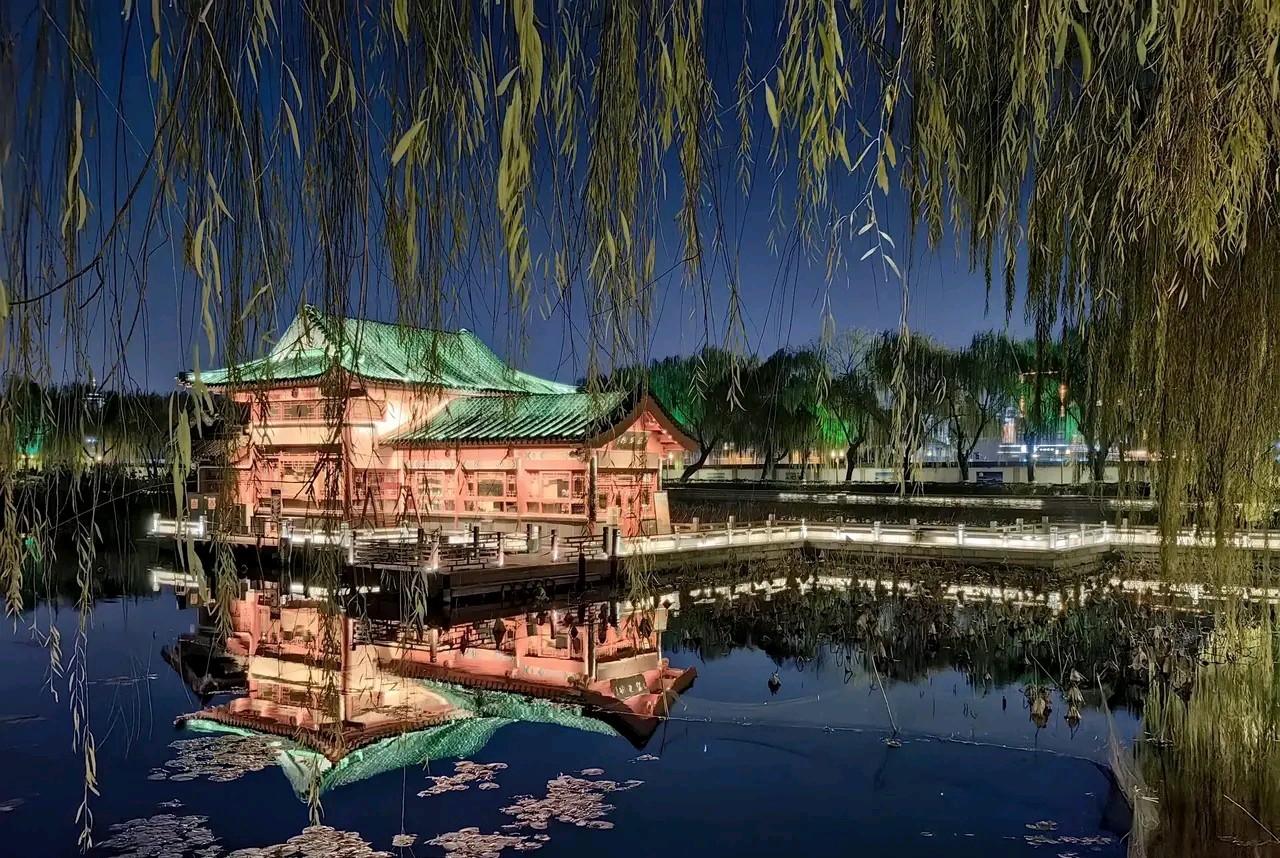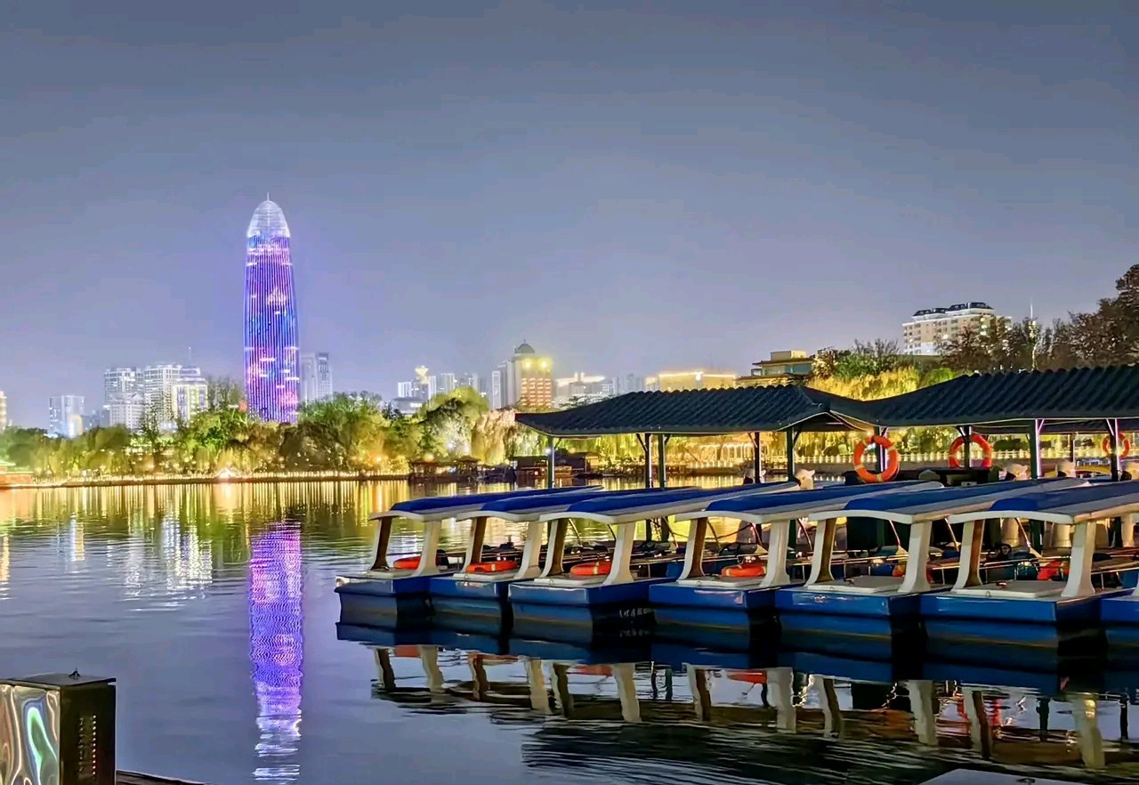 济南大明湖灯光璀璨夜色美景。第一高绿地中心在大明湖的映衬下显得更加雄壮挺拔。