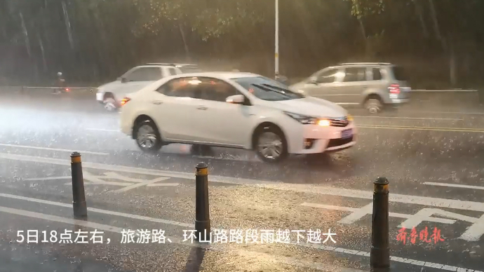5日18点左右,济南旅游路、环山路下起大雨。瞬间地上形成较多积水,提醒大家注意安全。