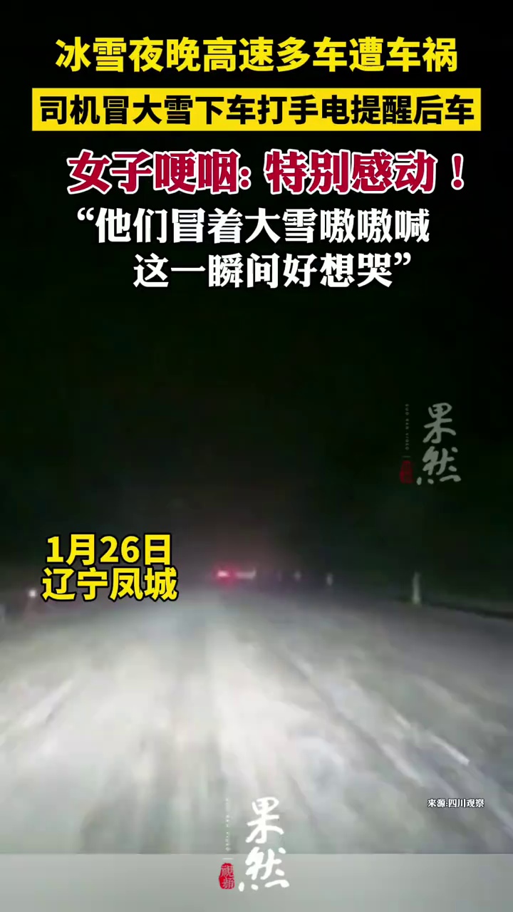 冰雪寒夜高速多车遭车祸,司机冒大雪下车打手电提醒后车