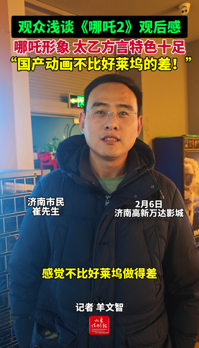 2月6日,济南市民崔先生浅谈《哪吒2》观后感,他觉得哪吒形象和太乙真人方言特色十足,国产动画不比好莱坞做得差!