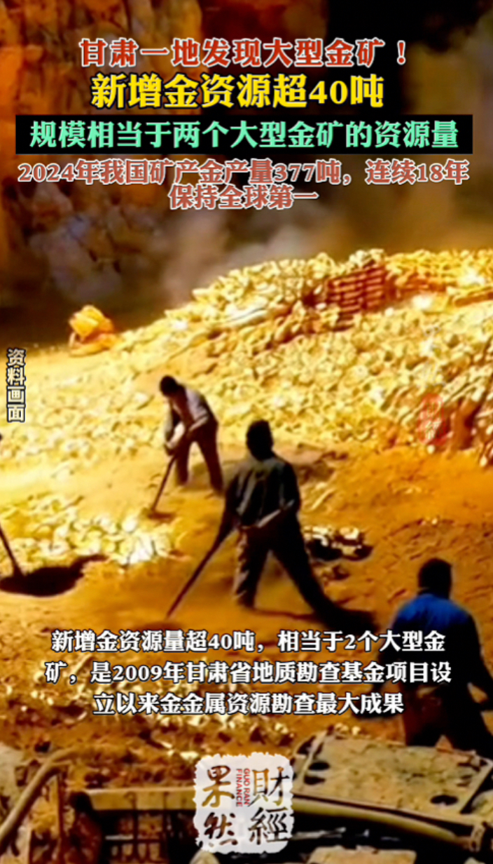 果然财经|甘肃一地发现大型金矿,新增金资源超40吨齐鲁晚报·齐鲁壹点客户端 10-16原创据甘肃省自然资源厅消息,近日,“甘肃省玉门市前红泉—黑山北滩地区1:5万矿产远景调查”项目新发现了大型金矿。新增金资源量超40吨,相当于2个大型金矿,是2009年甘肃省地质勘查基金项目设立以来金金属资源勘查最大成果。据介绍,甘肃省黄金资源储量位居全国第二,北山成矿带是省内重要的金矿床集中产出地段。